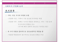 | 목차Ⅰ 사회복지 민영화(privatization) 논의 - 민영화 전략, 복지 혼합 Ⅱ 공공부문 & 민간부문 - 공공부문과 민간부문의 개념 - 시장의 실패 對 정부의 실패 - 공공부문과 민간부문의 혼합 유형, 역할 분담의 기준 Ⅲ 힌국 사회복지의 민영화 - 한국 사회복지 민영화 현황 - 바우처 제도 관련 논의 본문사회복지 민영화(privatization) 신자유주의와 민영화 재정적 효율성 - 사회적 위험에 대한 대응을 위해 사용되는 정부재정지출의 한계 극복 사회복지 전 영역에서 새로운 공급체계로의 개편 등 변화 예고 공공부문 vs 민간부문 각 영역의 개념, 장단점 등의 이론적 배경 습득 - 공공부문과 민간부문의 다양한 혼합형태 및 각각의 장단점 파악 우리나라의 민영화 진행 방향에 대한 제언 하고 싶은 말- 본 과제는 여러 학우가 정성을 들어 작성했습니다. - 제 자료가 구입자분에게 꼭 필요한 내용이 되시기 바랍니다. - 목차와 미리보기를 참고하셔서 좋은 레포트 작성하시기 바랍니다. |