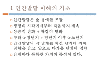| 목차1. 인간발달 이해의 기초 2. 인간발달과 관련된 개념 3. 인간발달의 세 영역 4. 아동 및 청소년 시기 5. 에릭슨의 심리사회적 발달단계 6. 유아기 7. 아동기 8. 아동기에 자주 드러나는 문제 9. 청소년기의 특징 10. 청소년기의 심리적 과제 본문1. 인간발달 이해의 기초 - 인간발달은 全 생애를 포괄 - 생명의 시작에서부터 죽음까지 계속 - 상승적 변화 + 하강적 변화 - 수태-> 청년기 + 청년기 이후-> 노년기 - 인간발달의 각 단계는 이전 단계에 의해 영향을 받고, 앞으로 다가올 단계에 영향 단계마다 독특한 가치와 특성이 있다. 하고 싶은 말본 자료는 아동과 청소년 발달의 기본과제에 대해 서술한 자료로 인간발달 이해의 기초, 인간발달과 관련된 개념, 인간발달의 세 영역, 아동 및 청소년 시기, 에릭슨의 심리사회적 발달단계, 유아기, 아동기, 아동기에 자주 드러나는 문제, 청소년기의 특징, 청소년기의 심리적 과제(1) 청소년기(자아정체감 형성), 2) 의존과 자립을 둘러싼 갈등, 3) 성적 발달, 4) 또래집단의 영향, 5) 사회의 요구와 개인의 발달수준, 6) 가족문제) 등에 대해 간단명료하게 설명한 자료임 |