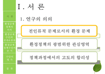 | 목차Ⅰ. 서 론 Ⅱ. 환경규제정책의 이론적 의의 Ⅲ. 환경규제수단의 종류 및 분류 Ⅳ. 환경규제정책 수단의 분석 Ⅴ. 수단의 평가 Ⅵ. 결 론 본문Ⅰ. 서 론 1. 연구의 의의 전인류적 문제로서의 환경 문제 환경정책의 광범위한 관심영역 정책과정에서의 고도의 합리성 참고문헌녹색법률센터 (2009) 환경보전을 위한 정책수단. 1 환경계획과 환경기준/직접적 규제와 간접적 규제/자율적 규제. 한국행정학회 (2009) 환경규제의 역사적 흐름 고찰 및 합리적 개선 방안 연구. 김호석 (2009) 환경규제로 인한 경제적 효과 사례 연구 . 환경부. 설계경 외법논집 (2008년 2월) 환경규제의 경제적 수단에 관한 소고 . 한국외국어대학교 전문분야연구센터 법학연구소. 김지원 (2004년 8월) 환경정책에서의 경제적 유인제도에 관한 연구 . 한국방송통신대학교. 홍인기 (2011). 기후변화 대응정책 결정과정에서 조세정책의 배제로 인한 정책거버넌스에 관한 고찰. 한국 조세연구 포럼. 노동운 ,강윤영 ,신정수 (2004). 온실가스 배출저감 정책수단이 제조업의 생산성에 미치는 영향. 에너지 경제 연구원. 김주영 (2002. 8). 국내 환경 라벨링 제도에 관한 연구 : 환경마크제도 활성화 방안을 중심으로.서울. 고려대 대학원. 머니투데이 11월21일 "경제규제가 무역장벽으로 수출길 막힐라" 하고 싶은 말- 본 과제는 여러 학우가 정성을 들어 작성했습니다. - 제 자료가 구입자분에게 꼭 필요한 내용이 되시기 바랍니다. - 목차와 미리보기를 참고하셔서 좋은 레포트 작성하시기 바랍니다. |